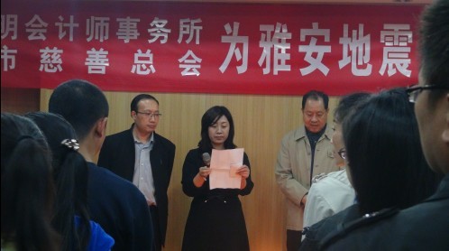 圖為陳明集團(tuán)董事長陳雪琴代表單位為雅安捐款